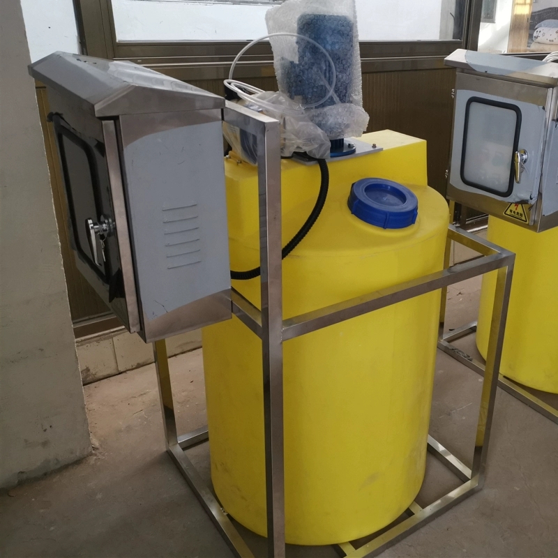 PH调节加药装置标准的配置清单:1000L加药桶一只(直径:1000 总高:1460 人孔:260 壁厚:6mm 材质:PE)+赛高AKS803电磁隔膜计量泵两台(一备一用 流量:20-110L/H 电压:220V 功率:40W)+BLD09-11-0.75KW搅拌机一台(南方电机 0.75KW 380V)+PH计一套(仪表+电极)+电控箱一套(碳钢烤漆 厚 套内控制 携带PLC远传输送端口)+碳钢三漆支撑架一套。
